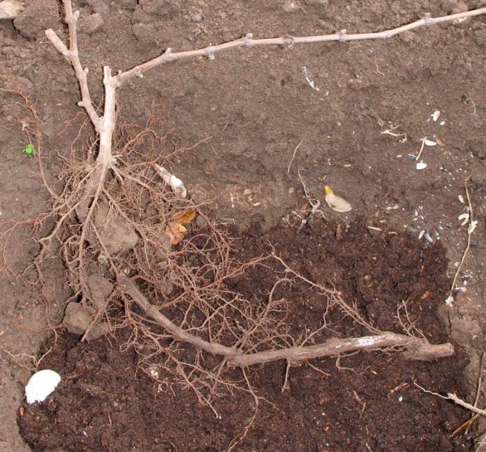 na krótko przed sadzeniem łodygi sadzonek należy przyciąć, aby pozostały 3 lub 4 Oczy. Następnie korzenie na górnych węzłach są cięte, a pozostałe korzenie są lekko skracane. Następnie system korzeniowy sadzonek zanurza się w roztworze stymulatora wzrostu korzeni (na przykład Heteroauxin) na pół dnia (12 godzin).