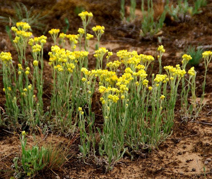 ta bylina znajduje się w Eurazji i woli rosnąć na skalistych kopcach, słonych bagnach i piaszczystej gliny. W drzewiastym krótkim kłączu rośnie kilka prostych, prawie nierozgałęzionych łodyg o wysokości około 0,3-0,4 m.na powierzchni kolejnych podłużnych płytek liściowych występuje filcowe pokwitanie. Kwitnienie obserwuje się od czerwca do sierpnia, podczas gdy roślina jest ozdobiona małymi koszami o żółtym kolorze, osiągającymi średnicę od 0,4 do 0,6 centymetra. Kwiatostany są częścią złożonych osłon o większej wielkości. Ten kwiat jest stosowany jako roślina lecznicza w medycynie.