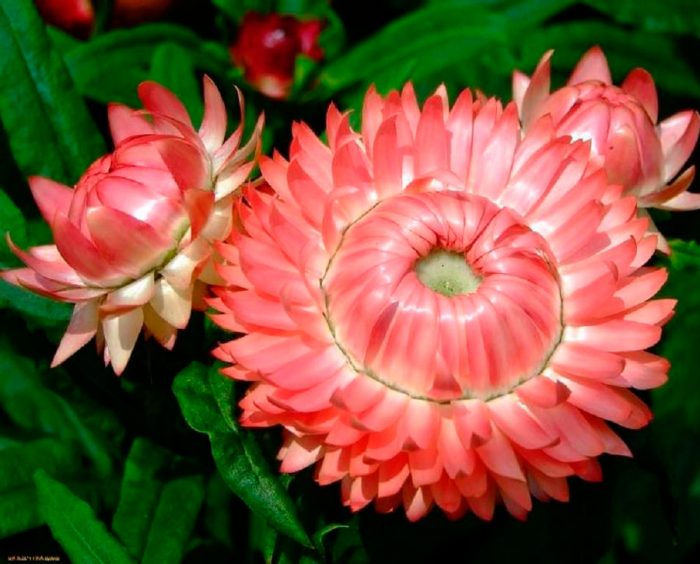 łodygi tej byliny są dobrze rozgałęzione i osiągają wysokość od 0,6 do 0,8 m.wyprostowane żebrowane pędy są ozdobione gładkimi ciemnozielonymi liśćmi lancetowatymi. Gatunek ten różni się od reszty największymi kwiatostanami o najbardziej nasyconym kolorze. Z tego powodu ten gatunek jest bardzo popularny wśród ogrodników. W środku kwiatostanu znajdują się rurkowate małe kwiaty otoczone błyszczącymi opakowaniami o bogatym kolorze, które mogą być żółte, czerwone, różowe, pomarańczowe i białe. Kwitnienie tej rośliny rozpoczyna się w lipcu i zanika wraz z mrozem. Jeśli kwiaty zostaną zapylone, z czasem na ich miejscu utworzą się czubate strąki nasion.