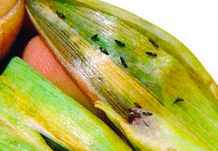 Jeśli na liściach orchidei utworzył się srebrny film, a na niewłaściwej powierzchni ― małe kropki i pociągnięcia, oznacza to, że został zajęty przez wciornastki. Uszkodzenia te są bardzo podobne do tych, które pozostają po przędziorkach, ale w tym przypadku ślady ugryzień są bardziej wyraźne. Wciornastki są dość trudne do wykrycia, ponieważ nawet przy niewielkim zagrożeniu szybko chowają się w mieszance gleby. I mogą łatwo przenosić się z jednego kwiatu na drugi za pomocą skrzydeł.