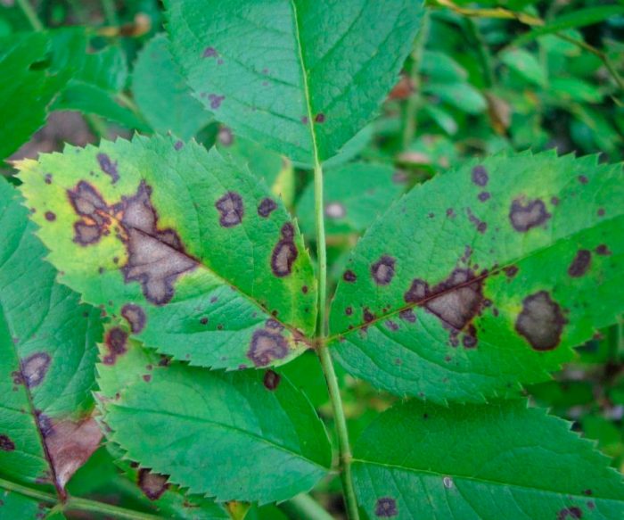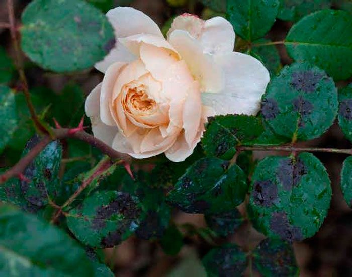 patogenem czarnej plamki na różach jest grzyb marssonina rosae, jest w stanie uderzyć zarówno w zielone łodygi krzewu, jak i jego liście. Na przedniej powierzchni blaszek liściowych pojawiają się białawo-czerwone plamy, które z czasem stają się czarne, są zaokrąglone i promienne, jakby otoczone frędzlami. Na początku wpływa to na dolne liście, ale infekcja szybko rozprzestrzenia się w krzaku. Dotknięte płytki liściowe są pomalowane na brązowo-szary kolor, w przyszłości obserwuje się ich skręcanie, obumieranie i latanie. Krzew słabnie i tworzy niewiele pąków lub wcale się nie pojawiają. Jeśli roślina jest bardzo dotknięta, to przed nadejściem okresu jesiennego wszystkie liście mogą z niej latać.
