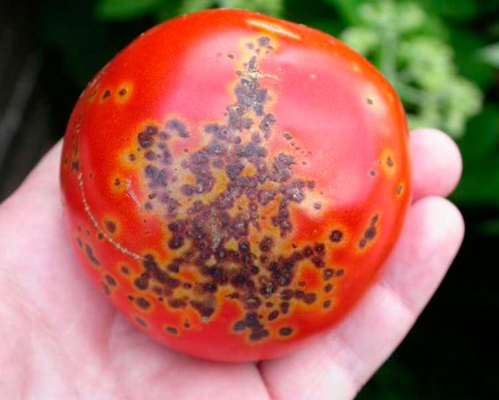 to bakteria Gram-ujemna w kształcie pręcika Xanthomonas vesicatoria jest czynnikiem sprawczym bakteryjnej czarnej plamki, na którą narażone są pomidory uprawiane zarówno w szklarni, jak i na otwartym terenie. W sadzonkach i młodych krzewach na powierzchni liści pojawiają się wodniste plamki, które z czasem zwiększają się do 0,1 - 0,2 cm, a ich krawędź stopniowo staje się żółta. Na dorosłych krzewach plamki są zwykle umieszczane na krawędziach płyt liściowych, a także na powierzchni ogonków i pędów. Na owoce wpływa również plamienie, na ich powierzchni powstają wypukłe kropki o ciemnym kolorze z wodnistym obrzeżem. Z czasem ich rozmiar wzrasta do 0,6-0,8 cm i stają się wrzodami. Czynnik sprawczy może znajdować się na resztkach roślin i nasionach przez długi czas, więc nie zapomnij zdezynfekować materiału siewnego przed siewem.