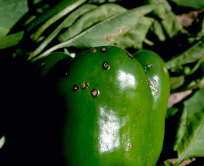 patogen czarnej plamki bakteryjnej na słodkiej papryce i pomidorach jest taki sam-to Xanthomonas vesicatoria. Najczęściej infekcja dotyczy młodych części krzewu, w wyniku czego na liściach, owocach, pędach, liścieniach i ogonkach pojawiają się kropkowane wodniste plamy. W miarę rozwoju choroby plamy stają się czarne, a ich kształt zmienia się w zaokrąglony lub kanciasty. Wielkość takich czarnych plam, które mają jasnożółte obramowanie, wynosi około 0,1-0,2 cm, plamy rozprzestrzeniają się wzdłuż żył liściowych, aw ich środku powstają żółtawe martwice z ciemnymi obrzeżami. Na powierzchni owoców powstają również wypukłe punkty czarnego odcienia, które są otoczone wodnistym obrzeżem. W miarę rozwoju choroby punkty zwiększają się do 0,6-0,8 cm i stają się gnijącymi wrzodami. Chroń paprykę przed czarnymi plamami i traktuj ją tymi samymi metodami i środkami, co pomidory.