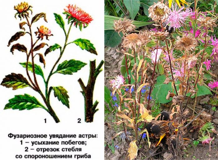 astry są dotknięte więdnięciem Fusarium podczas tworzenia pąków lub na samym początku otwierania kwiatów. Na chorych krzewach obserwuje się skręcanie liści, opadanie pąków, a także pojawienie się na pędach brązowych plam o podłużnym kształcie, podczas gdy brązowe paski tworzą się w okolicy szyi korzenia. Na chorych łodygach dochodzi do pęknięcia tkanek, a na powierzchni obszarów podstawowych tworzy się płytka grzybni lub małe podkładki o jasnoróżowym kolorze, wzrost Aster zatrzymuje się i szybko więdną. Patogeny dostają się do rośliny przez korzenie i bardzo szybko przechodzą przez układ naczyniowy, który nie może już normalnie funkcjonować.