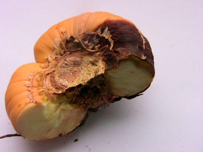 - dno staje się miękkie i wodniste, po czym powstaje na nim grzybnia o żółtym, białym lub różowym odcieniu;