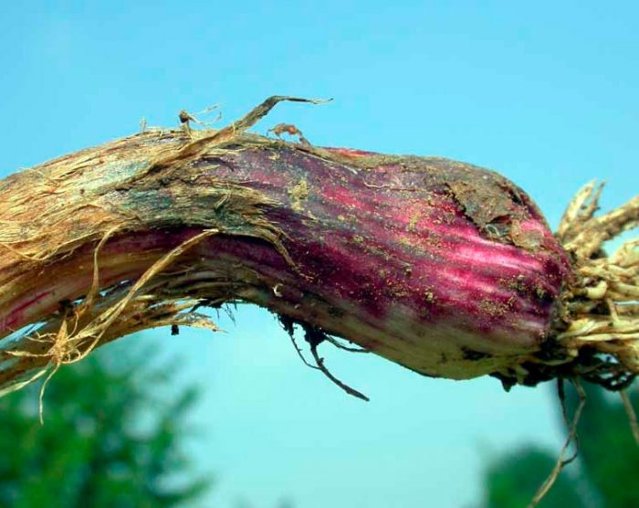 Fusarium czosnku, zwane również zgnilizną dna, należy do najbardziej niebezpiecznych chorób, które mogą wpływać na cebulę i czosnek. Bardzo często na taką chorobę wpływają rośliny uprawiane w regionach o łagodnych ciepłych zimach i upalnym lecie. W takich regionach, z powodu uszkodzenia czosnku i cebuli przez Fusarium, ogrodnik może stracić około 70 procent zbiorów. W tym przypadku walka z Fusarium jest skomplikowana, ponieważ uprawy cebuli mogą wpływać na 8 różnych patogenów grupy Fusarium. Każdy z patogenów ma specjalny stopień aktywności, który zależy od warunków chemiczno-klimatycznych. Rośliny są dotknięte wodą używaną do podlewania, glebą, chorym materiałem do sadzenia i resztkami roślin z zeszłorocznych zbiorów. Podczas sprawdzania ząbków czosnku przed sadzeniem bardzo ważne jest usunięcie tych, na których powierzchni występują uszkodzenia. Zmiany w Fusarium czosnku mogą wystąpić zarówno w sezonie wegetacyjnym, jak i w magazynie przy wysokiej wilgotności powietrza i temperaturze 13-30 stopni. Najbardziej aktywna choroba rozwija się w temperaturze od 22 do 23 stopni.