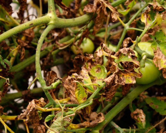 największe niebezpieczeństwo więdnięcia pomidorów Fusarium występuje w szklarniach monokulturowych. Chora roślina ma uszkodzenie układu naczyniowego, a patogeny Fusarium przenikają do rośliny z ziemi przez punkty wzrostu korzeni bocznych. W miarę rozwoju choroby grzybnia rozprzestrzenia się na naczyniach ogonków, pędów, łodyg, owoców i łodyg, a nawet nasiona pomidorów są dotknięte. Czas trwania okresu inkubacji może wynosić od 1 do 4 tygodni. Zewnętrzne oznaki Fusarium pomidorów można łatwo pomylić z objawami więdnięcia wertykalnego, ale w Fusarium chloroza liści jest znacznie jaśniejsza. Początkowo Fusarium wpływa na płytki liściowe niższego poziomu, a następnie choroba stopniowo podnosi się, aż krzew zostanie przez niego całkowicie pokryty. Pierwszymi objawami tej choroby są letarg górnych części łodygi, po czym płytki liściowe zaczynają się zwijać, a ogonki deformują się. Jeśli łodyga zostanie odcięta od chorego krzewu, zobaczysz, że naczynia stały się brązowe. Fakt, że naczynia są ciemne, można zobaczyć nawet przez tkanki okrywowe. W dotkniętych pomidorach liście z czasem stają się żółte lub wyblakłe, a smugi na nich odbarwiają się.