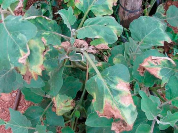 Z reguły więdnięcie fusarium pojawia się w bakłażanie podczas kwitnienia. Występuje żółknięcie, więdnięcie i suszenie liści, podczas gdy najpierw obserwuje się uszkodzenie płyt liściowych niższego poziomu, a następnie Fusarium rozprzestrzenia się na cały krzew. Jeśli odetniesz łodygę, zobaczysz dotknięte naczynia, które stały się brązowe, a na systemie korzeniowym pojawi się różowa powłoka. Na tę kulturę wpływa Fusarium poprzez materiał siewny lub glebę, gdzie patogeny mogą utrzymywać się dłużej niż 10 lat. Patogenne grzyby mogą dostać się do krzaka przez włosy korzeniowe, jeśli w systemie korzeniowym występują uszkodzenia mechaniczne. Chore krzewy czasami nie umierają do końca sezonu wegetacyjnego, ale są wyraźnie opóźnione we wzroście, a jeśli powstają na nich owoce, jest ich niewiele i są małe. W przypadku więdnięcia sadzonek Fusarium często obserwuje się rozwój zgnilizny korzeni i korzeni. Najbardziej aktywna choroba zaczyna się rozwijać z wysoką kwasowością gleby i ciepłem(powyżej 25 stopni).