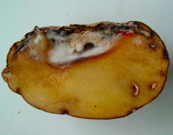 sucha zgnilizna Fusarium zaczyna się rozwijać na bulwach w magazynie, zaczyna psuć ziemniaki ze stolon. Na ich powierzchni powstają lekko wcięte plamy o brązowo-szarym odcieniu, podczas gdy miąższ pod nimi wysycha, staje się zepsuty, a następnie z czasem pojawiają się w nim puste przestrzenie wypełnione grzybnią. Na powierzchni ziemniaka tworzą się podkładki o jasnoróżowym, jasnożółtym lub białawym odcieniu. Bulwy dotknięte Fusarium pojawiają się nitkowate kiełki podczas kiełkowania. Sąsiednie bulwy są dotknięte infekcją w krótkim czasie.