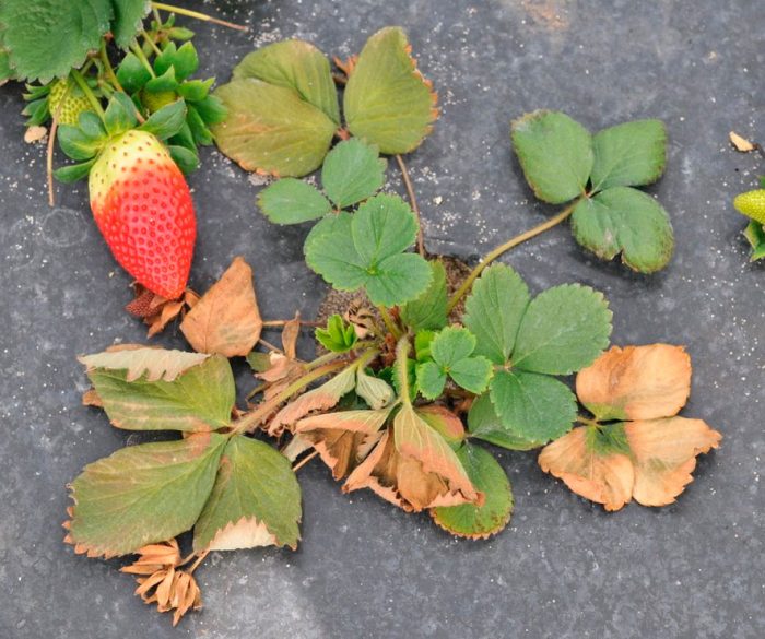 Pierwsze objawy uszkodzenia truskawek przez więdnięcie fusarium są uważane za: pojawienie się martwicy na krawędzi blaszek liściowych i ich niewielka utrata turgoru. Z czasem liście i ogonki brązowieją, zmieniają kolor na brązowy, prawie czarny, odcień, a następnie następuje ich śmierć. Rozeta rozpada się, a krzewy wydają się dociskać do powierzchni gleby. Czas trwania całego procesu wynosi około 6 tygodni. Z reguły najbardziej wyraźne oznaki choroby stają się zauważalne na samym początku okresu nalewania i dojrzewania owoców, w tym czasie krzewy szczególnie potrzebują wilgoci i składników odżywczych. Stopień uszkodzenia takiej rośliny przez Fusarium może zależeć od wieku sadzenia, warunków klimatycznych i poziomu technologii rolniczej. Należy pamiętać, że większość odmian truskawek jest podatna na więdnięcie fusarium. Istnieją jednak odmiany odporne na tę chorobę, na przykład Zenga.