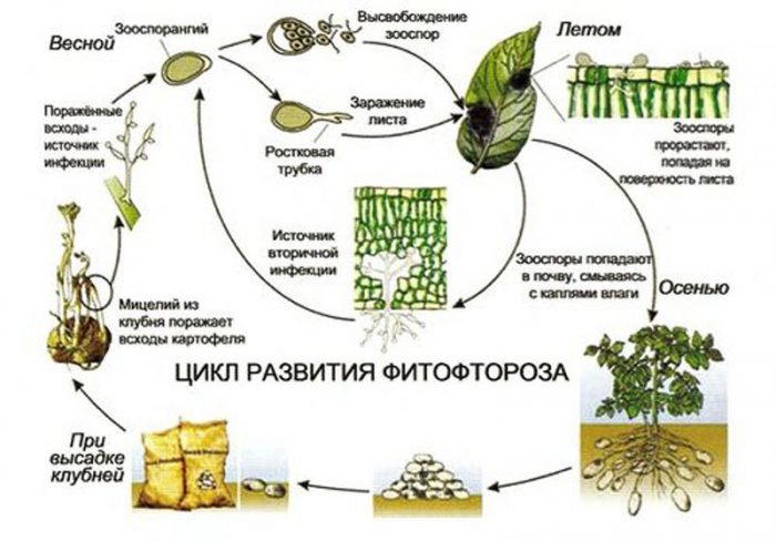 choroba zarazy (brązowa zgnilizna) zwykle objawia się w drugiej połowie okresu letniego. Jest w stanie zniszczyć do 70 procent zbiorów ziemniaków i pomidorów. Najprostszy grzyb Phytophtora infestans jest czynnikiem sprawczym takiej choroby, ma zdolność szybkiego rozmnażania, dlatego nazywa się go"zakaźnym zjadaczem roślin". Najczęściej najpierw dotknięte są dolne płytki liściowe, ale następnie choroba stopniowo rozprzestrzenia się na całą roślinę. Przy wysokiej wilgotności powietrza na liściach powstają brązowe plamki, które od dołu pokrywają puszystą białą powłokę składającą się z zarodników grzyba. Na dotkniętych pędach pojawiają się paski ciemnobrązowego koloru. Gdy wilgotność powietrza wzrasta, zaczyna się gnicie plam i pasków, ale gdy jest sucha pogoda, zaczynają wysychać. Z czasem dotknięte liście stają się podobne do suchej skorupy. Na powierzchni skórki dotkniętych bulw pojawiają się gnijące i rozkładające się obszary o ciemnym kolorze. A nawet pozornie zdrowe bulwy, które są przechowywane, mogą po pewnym czasie zacząć gnić.