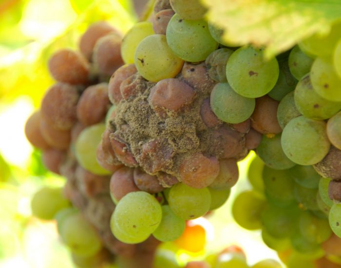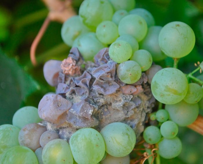 wszystkie nadziemne części winogron są podatne na szarą zgniliznę, ale Botrytis na owocach stanowi największe niebezpieczeństwo. Najbardziej aktywnie rozwija się i rozprzestrzenia choroba przy wysokiej wilgotności i temperaturze powietrza. Podczas tworzenia takich sprzyjających warunków początkowo rozwój choroby rozpoczyna się na uszkodzonych owocach, a następnie zgnilizna rozprzestrzenia się na całą szczotkę. W zarodnikach Botrytis okres inkubacji wynosi od 25 do 35 godzin. jeśli dotkniesz szarej płytki nazębnej, rozproszy się kurzem, a zarodniki grzyba spadną na pobliskie owoce i skupiska.