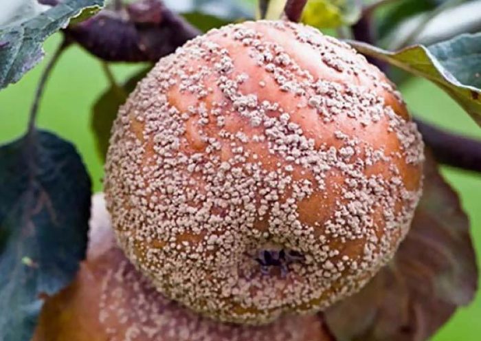 drzewo jabłoni jest również podatne na uszkodzenie szarej zgnilizny, w tym przypadku choroba jest również nazywana zgnilizną owoców, oparzeniem monilialnym lub moniliozą. Faktem jest, że w tym przypadku czynnikiem sprawczym choroby jest grzyb monilla, a nie Botrytis. Początkowo choroba wpływa na owoce, przez co zaczynają się szybko psuć. Jednak zarówno owoce, jak i kwiaty, jajniki, liście i gałęzie mogą cierpieć na moniliozę. Stają się brązowe, a następnie brązowieją i umierają. Największym zagrożeniem dla jabłoni jest monilialne oparzenie kory: na jej powierzchni pojawiają się rany i pęknięcia, przez które guma zaczyna płynąć, a także wysychają rozległe obszary drewna pod korą, a także zarośnięte gałęzie.