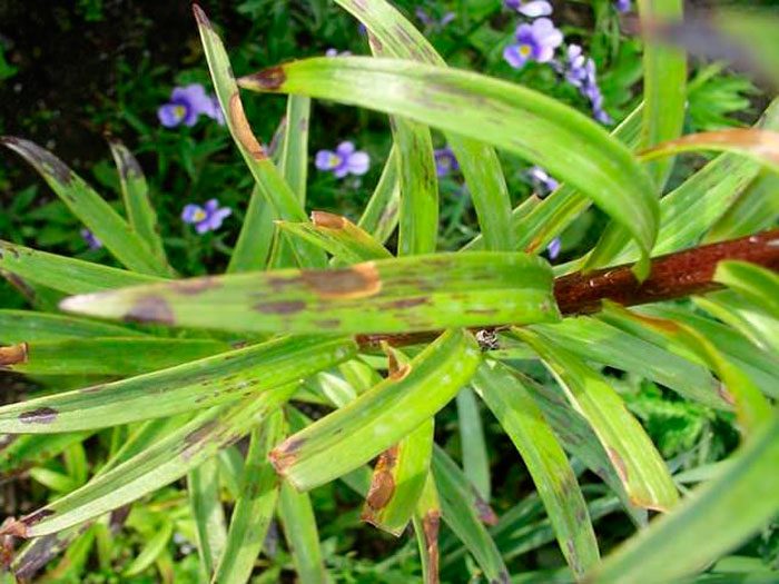 w krzakach dotkniętych szarą zgnilizną występuje znaczne spowolnienie wegetacji. Największą odpornością na tę chorobę są hybrydy LA i La. U chorych roślin powstają brązowe plamki o okrągłym kształcie z obrzeżem o ciemnoczerwonym kolorze. Z czasem powiększają się, a na ich powierzchni tworzy się szara powłoka.