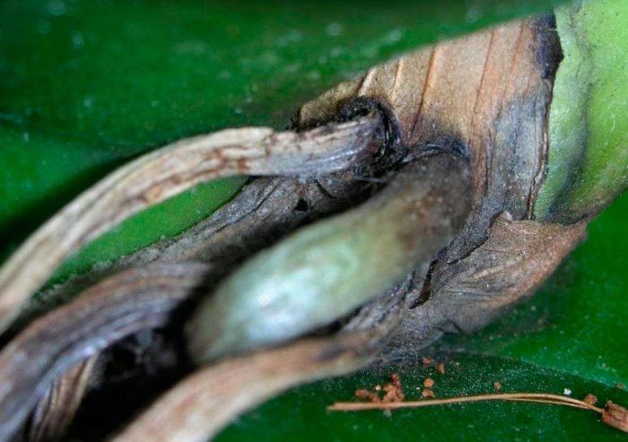 ponieważ pojawienie się i rozwój szarej zgnilizny przyczynia się do wilgoci, chłodu, a także niewystarczającej wentylacji, Rośliny domowe mogą również zachorować, na przykład: Cattlea lub phalaenopsis. Najczęściej na tę chorobę grzybiczą wpływają te krzewy, które są już dość stare. Początkowo na powierzchni rośliny powstają brązowe plamy, które stopniowo rosną, a wokół nich pojawia się różowawe obramowanie. Przy aktywnym rozwoju choroby plamy zaczynają się ze sobą łączyć, a na ich powierzchni pojawia się szara powłoka.