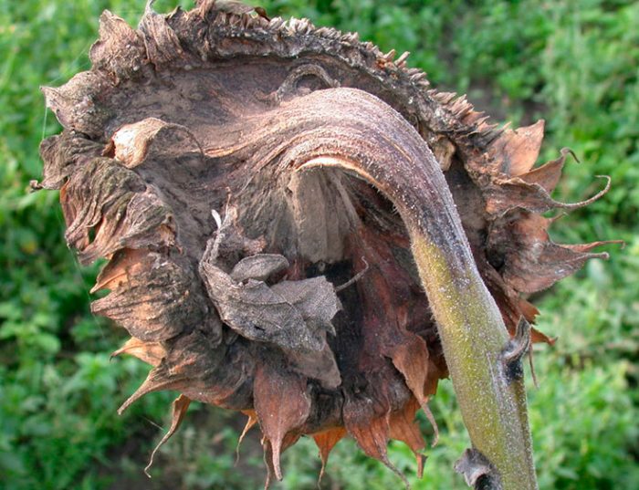 wszystkie nadziemne części słonecznika mogą zostać dotknięte szarą zgnilizną. U młodych krzewów dotkniętych chorobą podstawa łodygi zmienia kolor na żółty, a następnie brązowieje, a na powierzchni pojawia się szara powłoka, a łodyga, która znajduje się powyżej, staje się wyblakła i więdnie. Na niewłaściwej powierzchni kosza pojawiają się zgniłe plamki o brązowo-szarym kolorze, które mogą mieć brudną czerwoną obwódkę. Plamy te powiększają się, a na ich powierzchni tworzy się popielata powłoka. Nasiona znajdujące się w chorym koszu nie kiełkują, ale nawet jeśli pojawią się z nich kiełki, zostaną pomalowane na ciemnobrązowy kolor i natychmiast pojawi się na nich zgnilizna. Ta choroba może zniszczyć nawet połowę zbiorów słonecznika. W walce z nim natychmiast po wykryciu pierwszych oznak szarej zgnilizny krzewy są spryskiwane roztworem fungicydu Pictor. Podczas uprawy słonecznika konieczne jest przestrzeganie takich środków zapobiegawczych, jak: