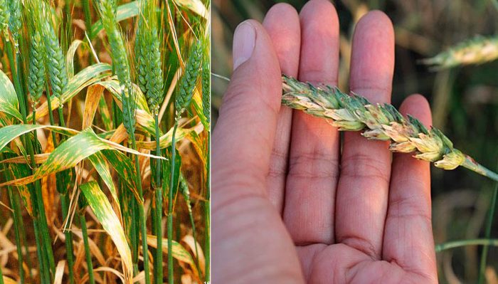 szczyt rozwoju białej plamki na pszenicy występuje w okresie nalewania ziarna, ale tylko pod warunkiem, że poziom wilgotności wyniesie około 90 procent, a Temperatura powietrza waha się od 14 do 22 stopni. Septorioza uszkadza uszy, liście i łodygi, na ich powierzchni powstają długie plamki o różnych odcieniach brązu i żółci. Choroba zaczyna się aktywnie rozwijać i rozprzestrzeniać podczas długotrwałych opadów deszczu. Kwiatostany dotkniętych kłosów pszenicy stają się barwne lub brązowe, słabo rozwinięte, aw niektórych przypadkach jałowe.