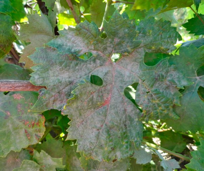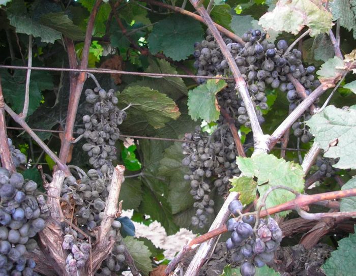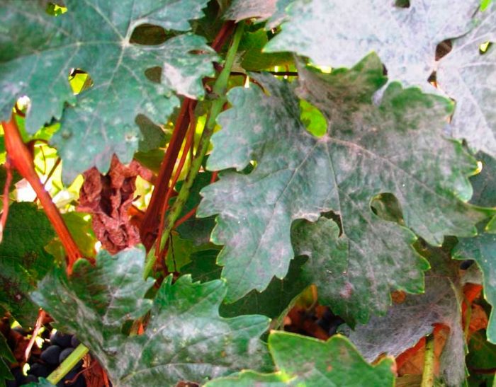 Jak wspomniano powyżej, oidium dla winogron jest mączniakiem prawdziwym, podczas gdy pleśń dla tej kultury jest mączniakiem rzekomym lub peronosporozą. Choroby te różnią się znacznie między sobą i są spowodowane przez różne patogeny. Łączy je fakt, że obie te choroby są grzybicze, a także fakt, że mogą zniszczyć prawie całą uprawę winogron. Objawy tych chorób różnią się znacznie między sobą. Szczegółowy opis objawów oidium można znaleźć powyżej. Jeśli winogrona są chore na pleśń, na przedniej powierzchni liści tworzą się jasnożółte oleiste plamki, po opadnięciu rosy lub mgły na niewłaściwej powierzchni chorych liści pojawia się płytka nazębna, po chwili staje się brązowa i wysycha. Najczęściej pleśń jest dotknięta młodymi liśćmi winogron, a także kwiatostanami, które stają się brązowe, łodygami (pojawiają się na nich czarne plamki) i niedojrzałymi owocami (stają się ciemne w obszarze łodygi i latają). Jeśli winogrona nie latają, nadal będą miały kwaśny smak. Jeśli krzak ma już w pełni dojrzałe owoce do czasu uszkodzenia pleśni, nie ucierpi.