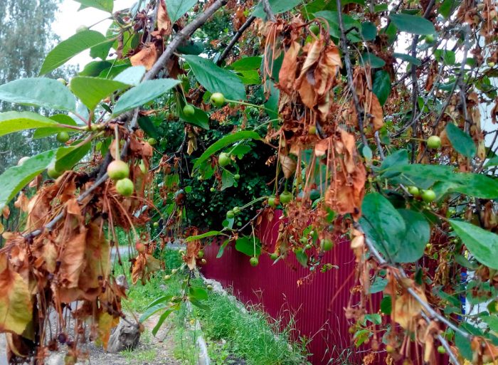 u chorych wiśni i wiśni obserwuje się więdnięcie i suszenie kwiatów, gałęzi owocowych, a także liści, a neodrewniałe młode pędy wyglądają na zewnątrz, jakby zostały spalone przez ogień. W okresie kwitnienia zarodniki grzyba, które dostały się na słupek, z powodzeniem kiełkują i powodują uszkodzenie naczyń krwionośnych.