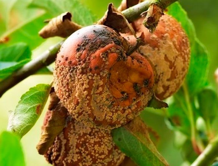morele i brzoskwinie są również dotknięte Moniliozą. W maju w pobliżu chorego drzewa można znaleźć latające kwiaty i jajniki, w czerwcu gałęzie wysychają na tych roślinach, po pewnym czasie liście ciemnieją i więdną, a owoce stają się brązowe. Jeśli dokładniej zbadasz takie drzewa, na powierzchni gałęzi można znaleźć pęknięcia i powstałe napływy gumy, a na owocach ― poduszki z zarodnikami o kremowym lub szarawym kolorze. W rezultacie chora roślina daje skromne zbiory, a tylko niewielka część owoców pozostaje zdrowa, ale pękają one po pewnym czasie i nie mają czasu na dojrzewanie.