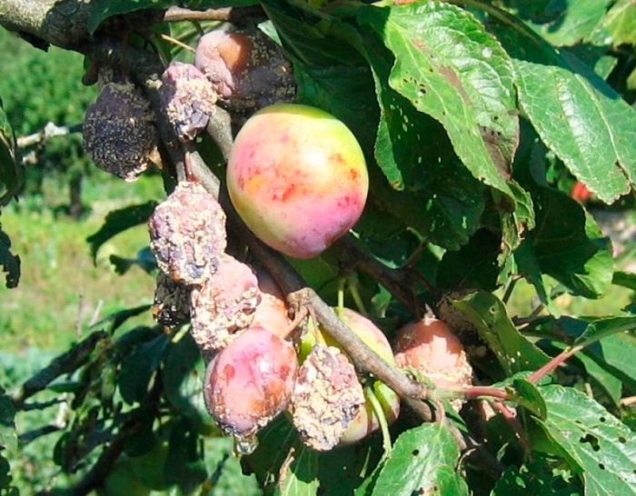 oznaki uszkodzenia śliwki przez moniliozę są bardzo podobne do objawów, które pojawiają się na innych drzewach owocowych, a mianowicie: owoce stają się brązowe, a na ich powierzchni powstają poduszki zarodników, podczas gdy liście, gałęzie i kwiaty wysychają i wyglądają, jakby zostały spalone przez ogień. Na powierzchni starych gałęzi pojawiają się pęknięcia, z których guma zaczyna wypływać, tworząc napływ z czasem. Należy pamiętać, że gdy zgnilizna owoców na powierzchni owoców, zarodniki są umieszczane losowo, a gdy są dotknięte szarą zgnilizną, tworzą koncentryczne koła.