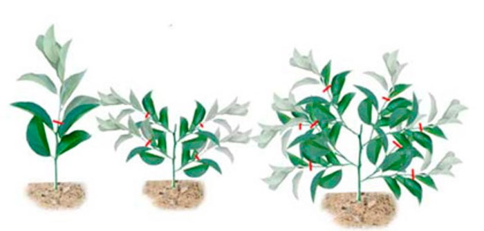 aby nadać koronie prawidłowy kształt, powinieneś skorzystać z metody szczypania. Kiedy pierwszy zerowy pęd osiągnie długość od 20 do 25 centymetrów, należy go uszczypnąć. Po pewnym czasie pęd jest uszczypnięty, cofając się od Starego uszczypnięcia od 15 do 20 centymetrów. Należy pamiętać, że między dwoma szczypcami na pędzie powinny znajdować się cztery dobrze rozwinięte pąki. Po pewnym czasie pojawią się 3 lub 4 główne łodygi, które powinny rosnąć w różnych kierunkach.