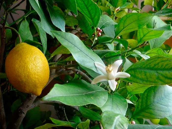 domowe drzewo cytrynowe to wiecznie zielona, niewymiarowa roślina, która jest byliną. Jego potężne gałęzie pokryte są kolcami. U młodych pędów górna część ma fioletowo-fioletowy kolor. Zielone płytki liściowe są skórzaste w dotyku, mają podłużny owalny kształt, a ich zęby znajdują się na krawędzi. Na powierzchni liści znajduje się wiele gruczołów, w których znajduje się olejek eteryczny. Żywotność jednej płytki liściowej wynosi od dwóch do trzech lat.