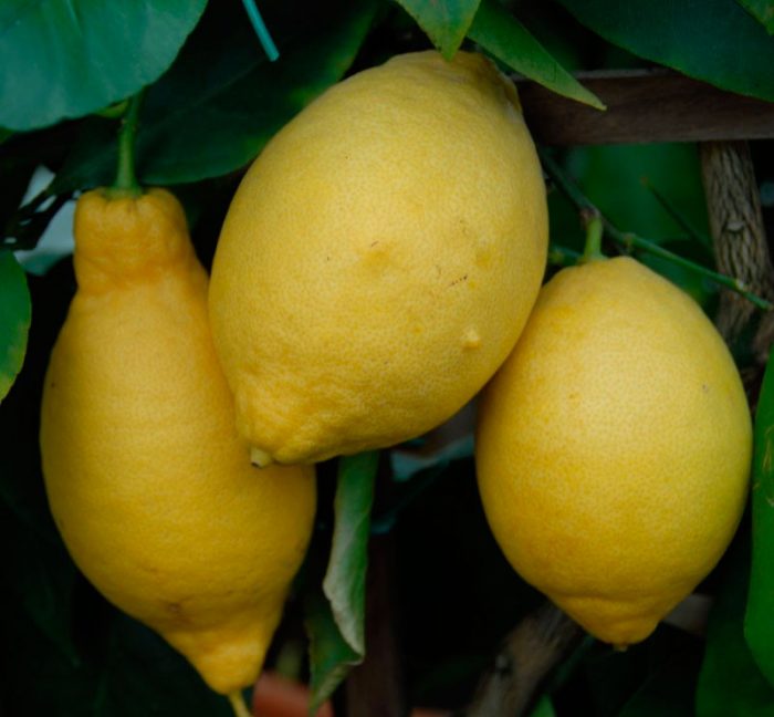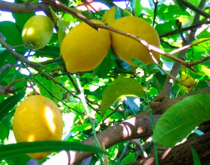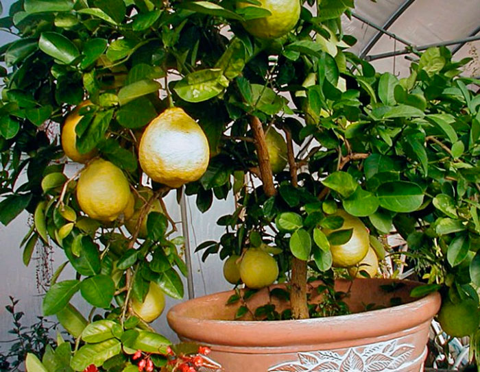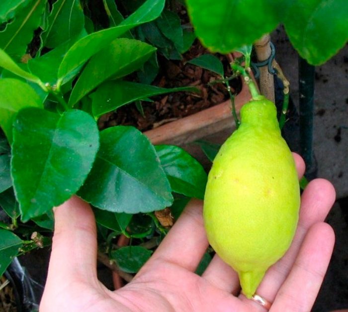 w ciągu 1 roku na jednym dorosłym drzewie może powstać od dwudziestu do czterdziestu owoców, które są znacznie smaczniejsze i lepsze niż cytryny rosnące na drzewach rosnących na otwartym terenie. Często owoce są całkowicie pozbawione nasion lub jest ich bardzo niewiele. Istnieją jednak takie owoce, w których znajduje się od jednego do dwóch tuzinów nasion. Cytryny na wierzchu pokryte są gładką błyszczącą szorstką lub lekko nierówną skórką, której grubość wynosi około 0,5 cm, a w razie potrzeby miąższ owocu można jeść razem ze skórką. W średnicy cytryny osiągają 50-70 mm, a w din ― około 100 mm, ich średnia masa-od 120 do 150 gramów. Istnieją jednak takie owoce, które ważą około pół kilograma.