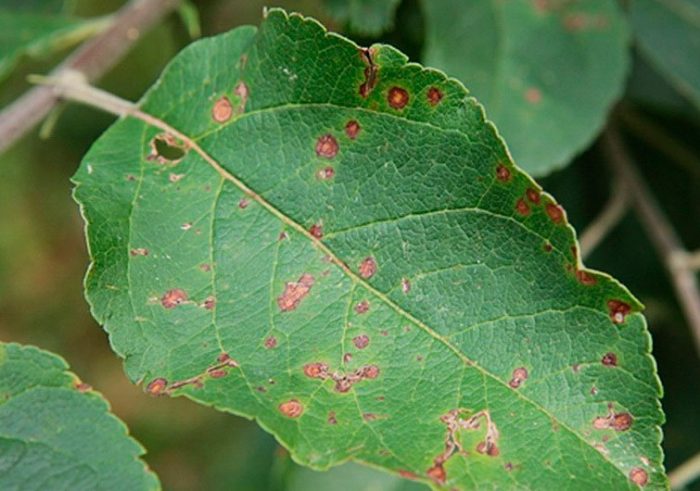 liście pigwy, malin, gruszy i jabłoni mogą również wpływać na brązowe plamienie (w tym przypadku nazywa się to również filostykozą). Plamy pojawiające się w tym przypadku na płytkach liściowych są zewnętrznie podobne do plam strupa, ale na ich powierzchni nie ma aksamitnej płytki nazębnej.