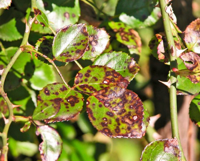 brązowe plamienie może również wpływać na róże, w tym przypadku choroba nazywa się marsoniozą i cercosporozą. Odmiany o błyszczących liściach są dotknięte tą chorobą znacznie rzadziej niż reszta. Aby wyleczyć dotkniętą różę, należy ją leczyć dwa razy lub trzy razy z przerwą 4-5 dni, w tym celu stosuje się produkty zawierające miedź, na przykład: Cyneb, mieszaninę Bordeaux (1%), chlorek miedzi (0,4%), Benlat lub roztwór siarczanu miedzi (2-3%), a aby lepiej przylegał do liści, dodaje się do niego od 200 do 300 gramów mydła w płynie. Przed przystąpieniem do przetwarzania usuń z krzaków wszystkie dotknięte, a także latające płytki liściowe, które koniecznie niszczą. Późną jesienią, przed przygotowaniem krzewów do zimowania, należy je spryskać mieszanką Bordeaux lub siarczanem miedzi. Aby uniknąć rozprzestrzeniania się choroby na inne rośliny, powierzchnia gleby pod krzakami jest pokryta warstwą ściółki, jako której stosuje się skoszoną rozdrobnioną trawę.