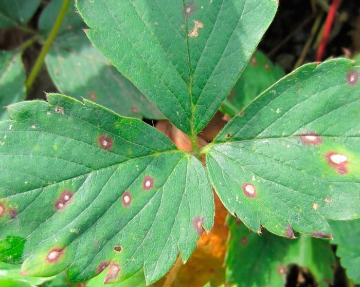 brązowe plamienie, które wpływa na prawie wszystkie odmiany truskawek, jest również nazywane "marsoniozą". W dotkniętych krzakach ich rozwój znacznie się pogarsza, a po pewnym czasie umierają. Pierwszy objaw choroby obejmuje purpurowe lub brązowe plamki, które tworzą się na starych płytkach liściowych, z czasem powiększają się. W rezultacie liście wysychają i umierają, aw pochmurne dni woda deszczowa zmywa patogenne zarodniki z jej powierzchni, które wraz z wodą dostają się do gleby i atakują nowe krzewy.