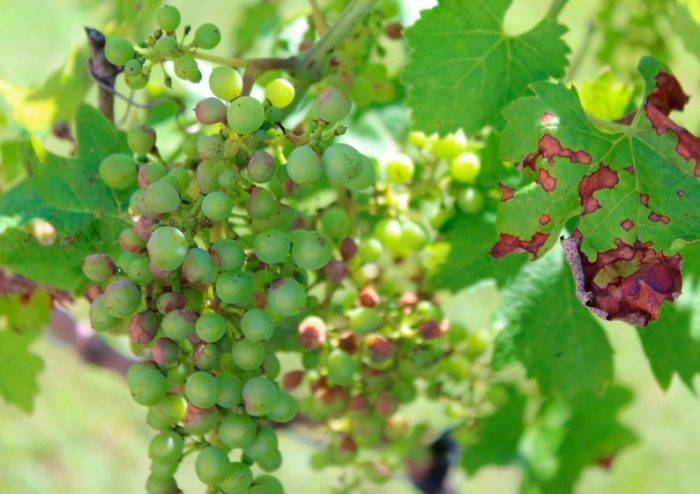 rozwój choroby obserwuje się na wszystkich zielonych częściach krzewu, ponieważ tylko młode tkanki są dotknięte antraknozą. Liście są dotknięte chorobą dopiero w wieku 25 dni, łodygi-aż zdrewniałe, a owoce-zanim zaczną dojrzewać. Na dotkniętych liściach tworzą się jasnoszare plamki z jasnoczerwonym lub ciemnym obrzeżem. Z biegiem czasu plamy stają się coraz większe, a materiał wewnątrz obręczy wylewa się. Na łodygach pojawiają się brązowe plamki, które po pewnym czasie stają się głębokimi owrzodzeniami o odcieniu kawy z ciemnofioletowym obrzeżem. Jeśli winogrona są bardzo dotknięte, jego łodygi stają się czarne, jakby zwęglone i stają się bardzo kruche. Liście na nich stają się mniejsze i stają się chlorotyczne. Na kwiatostanach pojawiają się również rany, a następnie obserwuje się ich suszenie, a także częściową lub całkowitą śmierć.