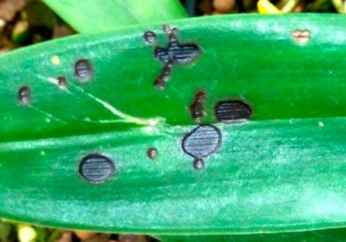 dotknięte płytki liściowe różnią się od zdrowych tym, że tworzą się na nich plamy o bardzo wyraźnych krawędziach, jest to podobne do tego, jak gdyby gorąca moneta została wciśnięta w arkusz. Na liściach phalaenopsis kolor plam jest czarny, podczas gdy na innych rodzajach storczyków ich kolor może być inny, nawet biały. U podstawy blaszek liściowych dotkniętych kwiatów pojawia się luźna formacja. Jeśli to możliwe, spróbuj uratować przynajmniej część dotkniętej płyty liściowej, podczas gdy miejsca cięcia muszą być traktowane zielenią, posiekanym węglem drzewnym lub cynamonem w proszku. Jeśli to możliwe, zmień podłoże na nowe, podczas gdy pojemnik należy traktować silnym roztworem manganu potasu. Najlepiej jest używać produktów najnowszej generacji do przetwarzania storczyków: Trichoderminy, fitosporyny-M lub Baktofitu. Dotkniętą roślinę można również spryskać środkami organicznymi, na przykład Manebem, Mankozebem lub innym lekiem o podobnym działaniu.