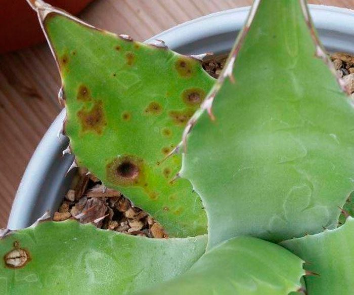 kaktusy są bardzo rzadko dotknięte antraknozą, gdy są trzymane w bardzo wysokiej wilgotności,co jest przeciwwskazane w sukulentach. Na roślinach powstają wcięte plamki, a czasami mają jasne obramowanie. Choroba rozprzestrzenia się bardzo szybko na miąższu kaktusa, w związku z tym nie powinieneś się wahać. Wszystkie dotknięte obszary należy ostrożnie wyciąć z góry sterylizowanym narzędziem, jednocześnie chwytając zdrową tkankę. Następnie potraktuj miejsca cięcia proszkiem węglowym. Do przetwarzania kaktusów nie stosuje się preparatów grzybobójczych, ponieważ mogą zniszczyć tę roślinę. W takim przypadku zaleca się obniżenie poziomu wilgotności powietrza do minimum, a następnie rozwój grzyba ustanie. Jednocześnie sama roślina nie ucierpi z powodu nadmiernie suchego powietrza.