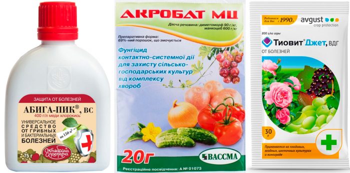 dotknięte krzewy spryskuje się roztworem mieszanki Bordeaux(1%). Po raz pierwszy rośliny należy traktować preparatem grzybobójczym wiosną po tym, jak długość młodych pędów wyniesie 10 centymetrów. Następujące środki zwalczają taką chorobę grzybiczą bardzo skutecznie: Previcur, Ordan, Acrobat, Abiga Peak, Fundazol, SCOR, MC i siarczan miedzi. Rośliny są spryskiwane systematycznie z przerwą 15 dni. Jeśli po przetworzeniu pada deszcz, musisz go ponownie przeprowadzić. Eksperci zalecają naprzemienne środki, w przeciwnym razie może rozwinąć się oporność (uzależnienie od leku). Przed spryskaniem krzewów odetnij i spal wszystkie obszary dotknięte chorobą.
