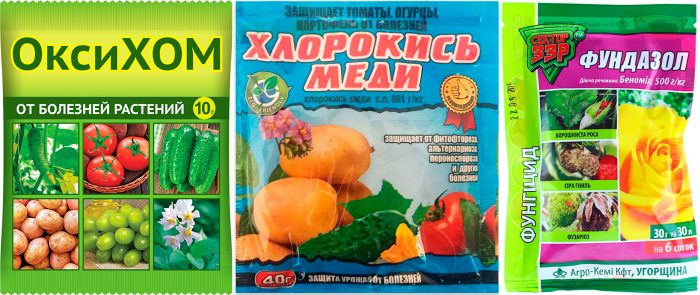 - Fundazol . Preparat ogólnoustrojowy o szerokim spektrum działania, stosowany również jako środek do zaprawiania materiału siewnego. Jest stosowany zarówno w leczeniu, jak i zapobieganiu chorobom, ale po przetworzeniu rośliny 2 lub 3 razy u patogenów rozwija się oporność.