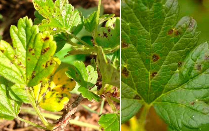 porzeczka jest dość często dotknięta antraknozą. Na początku na dolnych płytkach liściowych powstają małe plamy o brązowym kolorze, osiągające średnicę około 1 mm. z czasem plamy powiększają się i łączą ze sobą. W miarę rozwoju choroby liście wysychają i latają. Na powierzchni zielonych łodyg i ogonków pojawiają się wcięte plamki, które z czasem przekształcają się w rany. Na owocach powstają również pojedyncze owrzodzenia o białawym kolorze. W drugiej połowie lata na dotkniętych krzewach pozostaje tylko kilka młodych liści. Zaobserwowano, że czerwone porzeczki są bardziej podatne na antraknozę niż czarne porzeczki. Najbardziej aktywna choroba rozwija się podczas długotrwałych opadów deszczu.