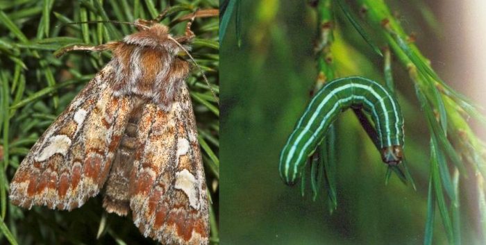ten szkodnik, podobnie jak wszystkie owady Lepidoptera, ma protekcjonalny kolor, dzięki czemu jest niewidoczny na powierzchni kory sosny. Na skrzydłach o szaro-brązowym kolorze znajdują się zygzaki, a także plamki koloru białego, czarnego lub ciemnobrązowego. Larwy są zabarwione na zielono i żywią się igłami. W szczycie żarłoczności całe hektary młodych świerków i sosen mogą pozostać bez liści.