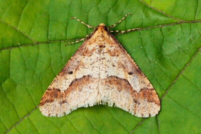 w tym gatunku motyl może być pomalowany na kremowy, brązowy lub jasnozielony. Na powierzchni skrzydeł znajdują się 2 paski o falistym kształcie. Gąsienice tego motyla żywią się pąkami, liśćmi i pąkami, podczas gdy osiedlają się zarówno na uprawach ogrodowych (śliwka wiśniowa, czereśnia, jabłoń, jarzębina i jagody), jak i na dzikich roślinach (brzoza, dąb, klon, lipa i dzika róża). Larwy te mają charakterystyczne poszarpane ślady ugryzień.