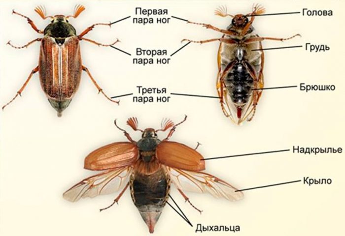na piersi majowego chrustu znajdują się 3 pary chodzących nóg, a każda z nich jest przymocowana do określonego segmentu. Na powierzchni nóg znajdują się włosy i kończą się pazurami, chrząszcze przylegają do liści i powierzchni kory. Na głowie znajdują się narządy zmysłów i usta, a na dolnej wardze znajdują się 2 sondy, które są narządami smaku i dotyku. Po bokach głowy znajdują się 2 złożone oczy fasetowane, przed nimi znajdują się 2 anteny z rozszerzonymi płytkami ― są to narządy węchu. U samicy narządy te są znacznie słabiej rozwinięte niż u samców. Owad może przechylać głowę, ale nie jest w stanie obrócić jej w lewo i prawo. Chrupnięcie majowe ma klatkę piersiową połączoną z brzuchem. Górna część brzucha jest zamknięta elytrami, spod nich wystaje tylko spiczasty czubek brzucha. Pod elytrami na brzuchu znajdują się skrzydła, a także przetchlinki, które są małymi otworami.