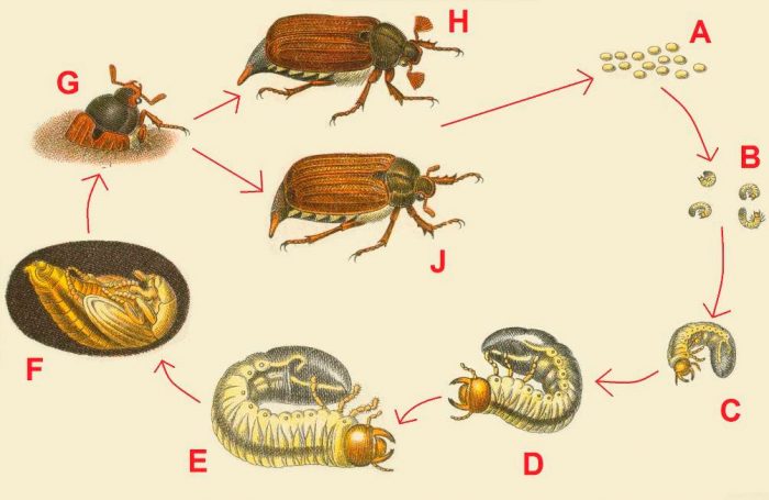 larwy pojawiają się z jaj, są grube i mają zakrzywiony kształt, ich kolor jest jasny, a głowa jest żółtawa lub brązowa. Larwa ma 3 pary małych łap, które są bardzo przylegające. W pierwszym okresie letnim larwy jedzą próchnicę i korzenie różnych ziół. Na zimę są zakopane w glebie na głębokość 150 cm, a wraz z nadejściem wiosny są wybierane bliżej systemu korzeniowego młodych drzew, to oni jedzą je w następnym sezonie. Już w trzecim roku Długość dorosłej larwy może wynosić od 4,5 do 6,5 cm, w tym czasie jest w stanie gryźć silne korzenie dorosłych drzew. Przekształcenie w poczwarkę obserwuje się w czwartym roku, w glebie można ją znaleźć na głębokości od 0,2 do 0,4 m. poczwarka ma kształt bardzo podobny do dorosłego chrustu majowego, ale jej skrzydła i głowa zgięta pod klatką piersiową są nieco krótsze. Poczwarka ma około 2,5 cm długości i osiąga szerokość do 1,8 cm, a czas trwania tej fazy rozwoju wynosi 15-30 dni, a zaczyna się w ostatnich dniach lipca lub pierwszych ― sierpnia. Następnie poczwarka staje się DOROSŁYM chrząszczem, a on popada w letarg przed nadejściem wiosny. Około maja, po ustaleniu ciepłej pogody i gdy pąki kwitną na drzewach, chrząszcze majowe wyłaniają się z ziemi, zaczynają latać i składają jaja.