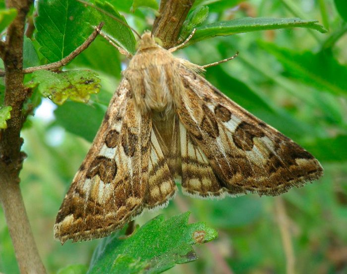 - ulotki Głogów . U samców takiej ćmy przednie skrzydła są jasnożółte, a u samic brązowawo-szare. Skrzydła zdobi wzór, u samców jest jasnobrązowy i rozmyty, a u samic ciemniejszy odcień. Kolor tylnych skrzydeł jest jaśniejszy, a samice mają jasnoczerwoną powłokę na ich powierzchni.