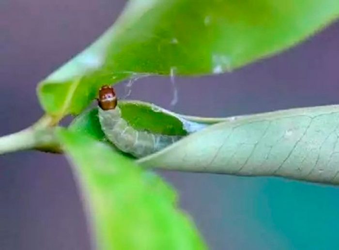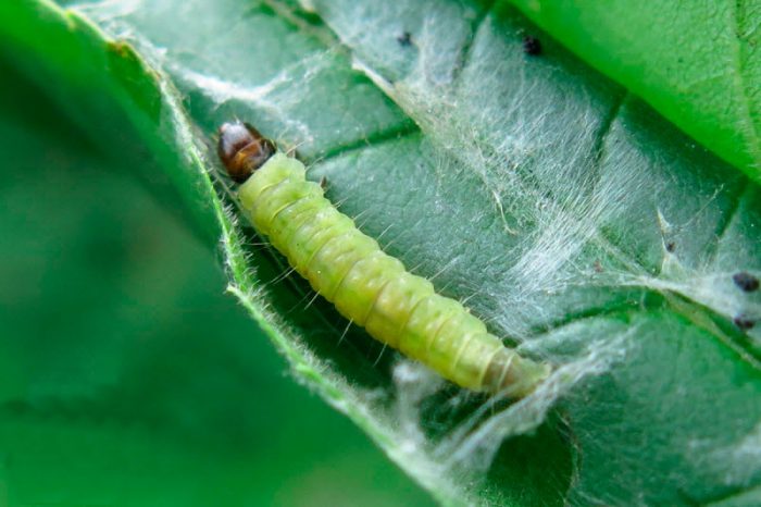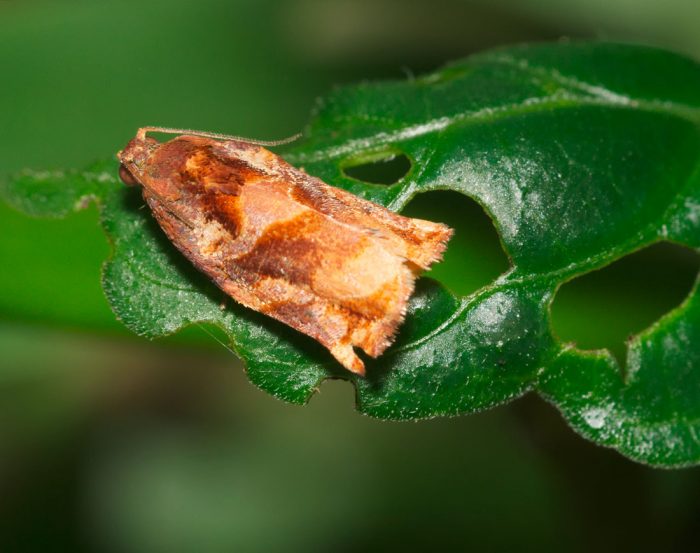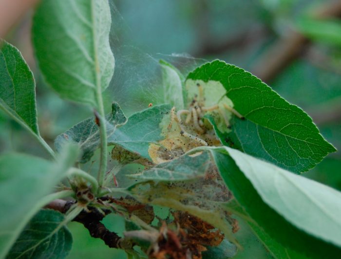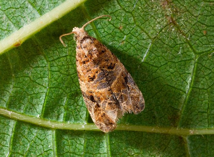 - liść jabłoni lub ćma jabłoni . Szary nocny motyl, którego rozpiętość skrzydeł może wynosić od półtora do dwóch centymetrów. Długość różowawej gąsienicy wynosi około 1,8 cm, jej głowa jest brązowa. Brązowożółta poczwarka osiąga od 0,9 do 1,2 cm długości.