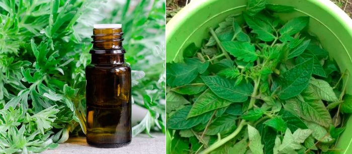 - wywar z piołunu . Aby go przygotować, musisz połączyć 10 litrów wody z 0,7-0,8 kg suchego piołunu lub ½ części wiadra posiekanego świeżego zioła. Mieszaninę należy zaparzać przez dwa dni, po czym gotuje się przez 30 minut na małym ogniu. Doprowadzić objętość schłodzonego i przefiltrowanego środka do 10 litrów. Przed obróbką produkt rozcieńcza się wodą w stosunku 1: 1.