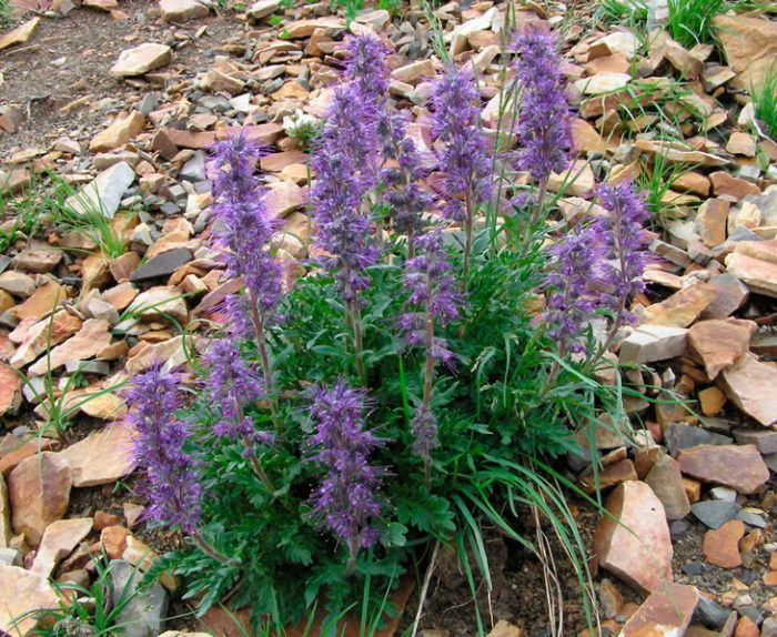 w warunkach naturalnych taka dość popularna roślina występuje w Ameryce Północnej od Kolorado po Alaskę i od Utah po Nowy Meksyk. Krzew ma kilka lub tylko 1 nierozgałęzioną łodygę, osiągającą wysokość około 0,45 m.na powierzchni rośliny znajduje się pokwitanie złożone z jedwabistych delikatnych włosów o srebrnym kolorze. Blachy są głęboko cięte. Kwiaty mają lawendowy, niebieski lub fioletowy kolor i długie pręciki, dzięki czemu roślina wygląda podobnie do Monarda lub łubinu. Odmiana:
