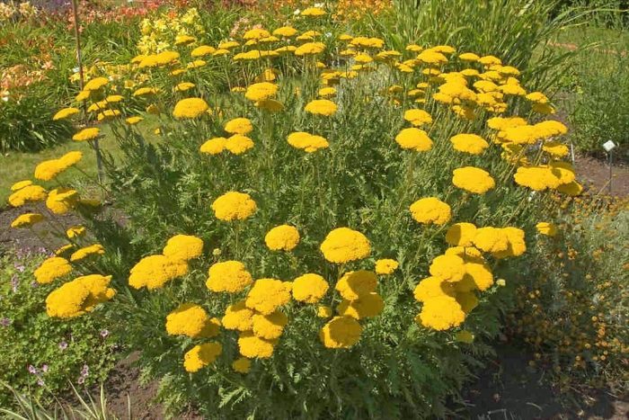 - Parker . Wysokość takiej wysokiej odmiany wynosi około 1,2 m. kolor kwiatostanów corymbose jest żółto-złoty.
