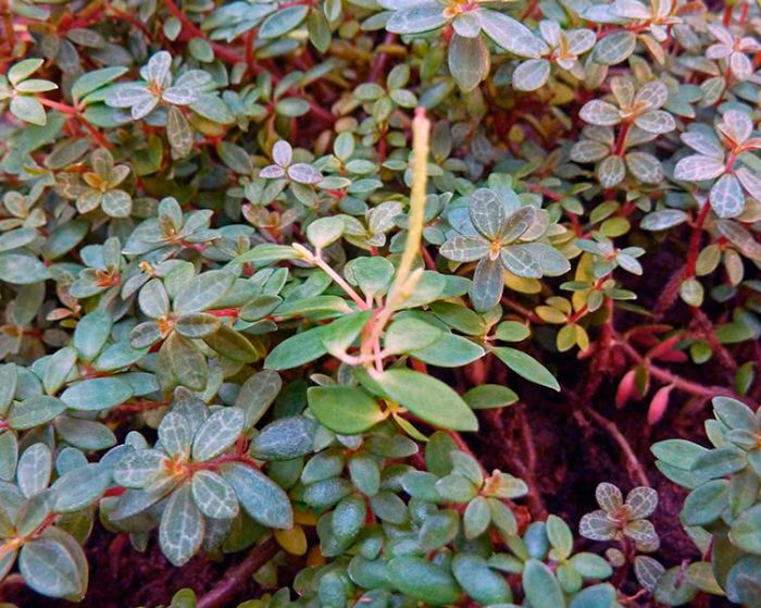 ten gatunek jest zielną wieloletnią rozgałęzioną rośliną o cienkich czerwonych łodygach. Małe owalne wydłużone liście na łodydze znajdują się po cztery kawałki naprzeciwko, jego przednia powierzchnia jest zielona, a niewłaściwa ― czerwona. Gatunek charakteryzuje się wysoką dekoracyjnością.