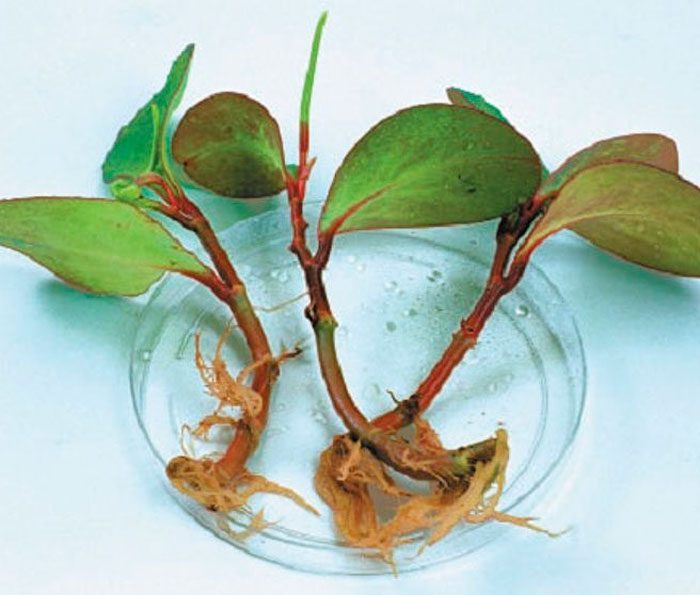 Wybierz absolutnie zdrową, nieuszkodzoną płytkę liściową na krzaku i odetnij ją bardzo ostrym nożem lub ostrzem. Musi zostawić krótki ogonek. Do ukorzenienia sadzi się go w mchu torfowca lub w podłożu z piasku i torfu, można go również umieścić w szklance wody, która jest regularnie (1 raz na 1-2 dni) zastępowana świeżą. Aby przyspieszyć proces ukorzeniania, liść umieszcza się w mini-szklarni. Po 20-30 dniach liść będzie musiał dać korzenie, po czym zostanie posadzony w doniczce o średnicy dochodzącej do 70 mm. Po tym, jak krzew staje się silniejszy, zaczynają się nim opiekować jako dorosła roślina.
