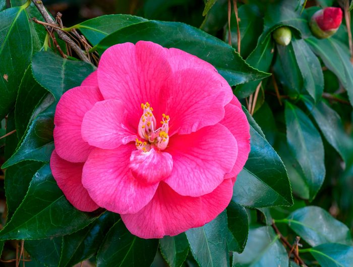 w naturze gatunek ten występuje w lasach Chin, Japonii i Korei. Takie krzewy lub drzewa mogą osiągnąć wysokość 15 metrów. Błyszczące, skórzaste liście ciemnozielonego koloru mają ząbki na krawędzi i są spiczaste na górze. Ich kształt jest eliptyczny lub jajowaty, a liście dorastają do 10 centymetrów długości. Proste kwiaty o średnicy osiągają 4 centymetry i mogą rosnąć zarówno pojedynczo, jak i kilka sztuk. Kwiaty są półpełne i frotte i są pomalowane na różowo, czerwono lub biało, a także występuje barwny kolor. Kwitnie od grudnia do kwietnia.