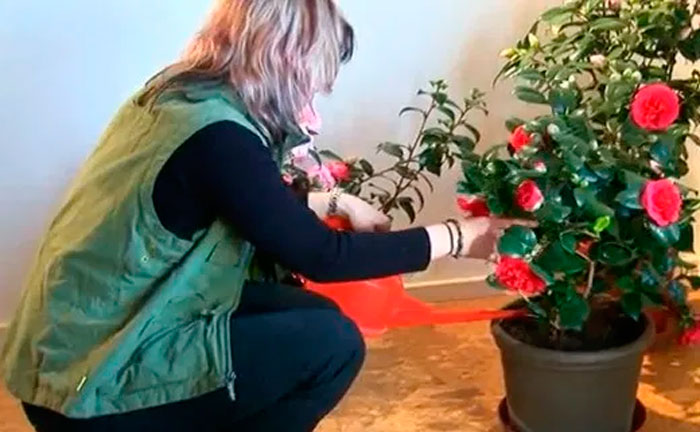 w ciepłym sezonie podlewanie powinno być obfite, ale upewnij się, że płyn nie stagnuje w glebie. Podlewanie odbywa się dopiero po wyschnięciu górnej warstwy podłoża. Do podlewania używaj wyjątkowo miękkiej i dobrze osiadłej wody. Przy zimnej zawartości zimą konieczne jest bardzo ostrożne podlewanie rośliny. Jeśli gleba stanie się kwaśna w wyniku przelewu, doprowadzi to do śmierci pąków, a liście zmienią kolor na brązowy. Jeśli pozwolisz na wysuszenie ziemnej śpiączki, w rezultacie Kamelia zrzuci wszystkie liście.
